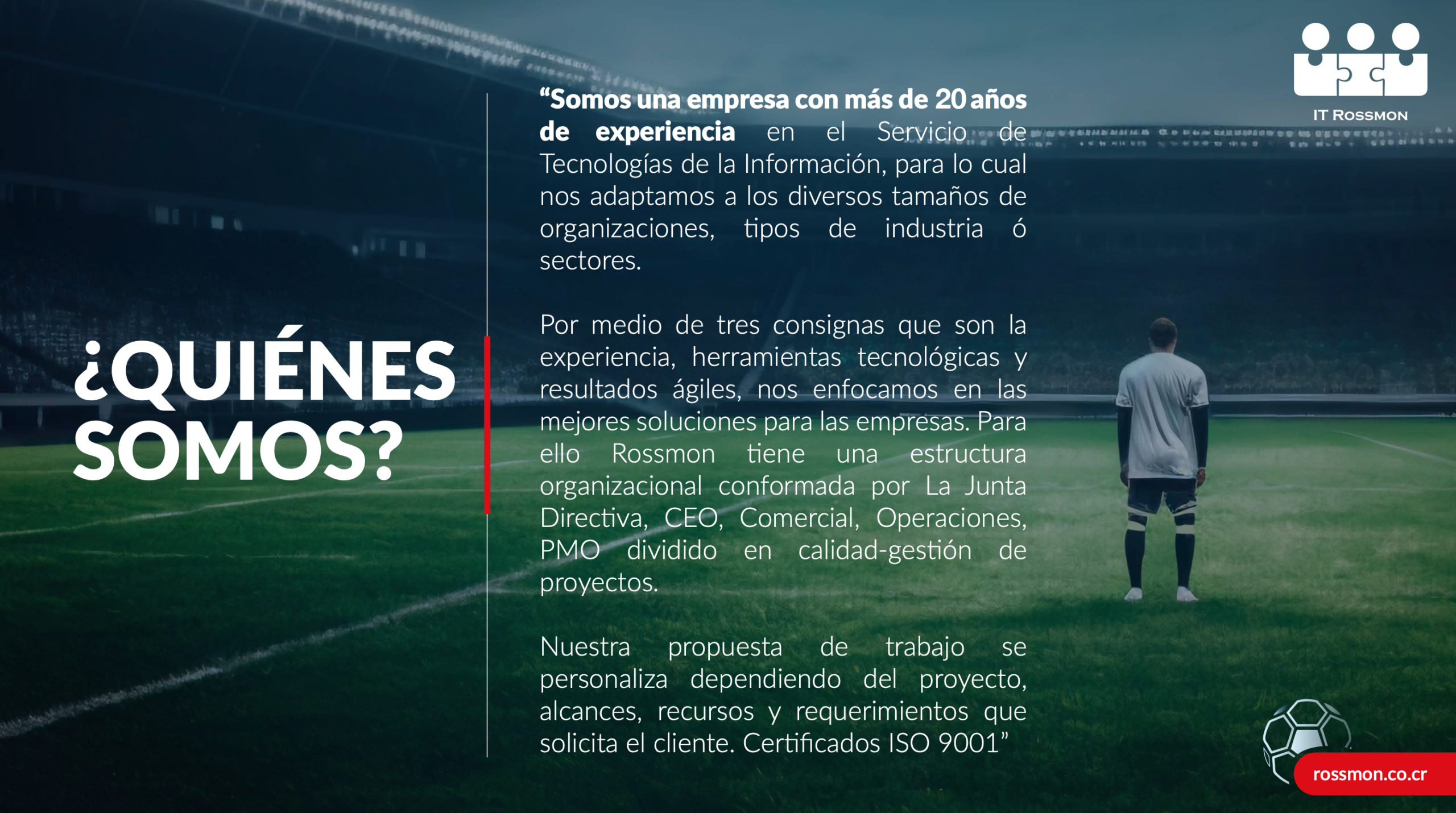 La filosofia de trabajar como el mejor equipo de Fútbol… En cada equipo se necesitan jugadores con diversas habilidades, así como un director para ordenarlos y realizar los objetivos en tiempo y forma. En IT Rossmon nos comprometemos con la captación de recurso humano junior y senior para que colaboren junto al director de proyectos, para garantizarle al cliente el desarrollo optimo e innovador de su empresa en el área administrativa o financiera, bajo 4 valores importantes.